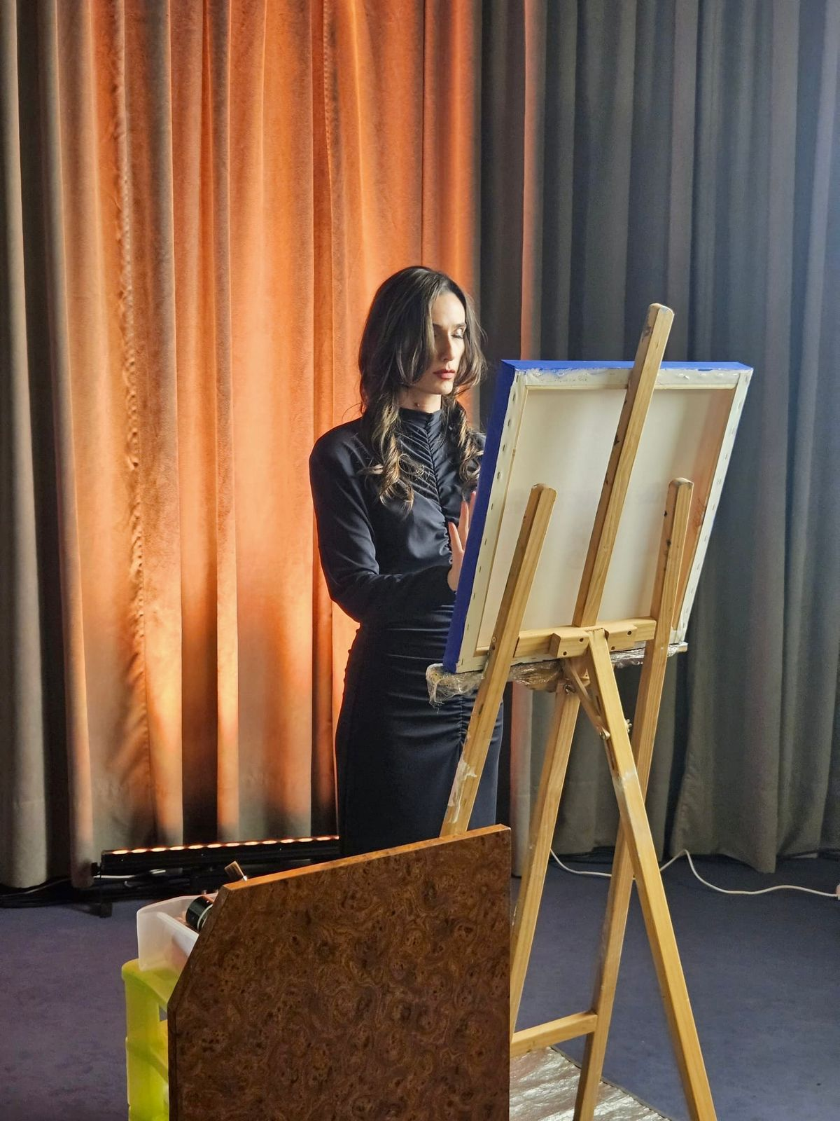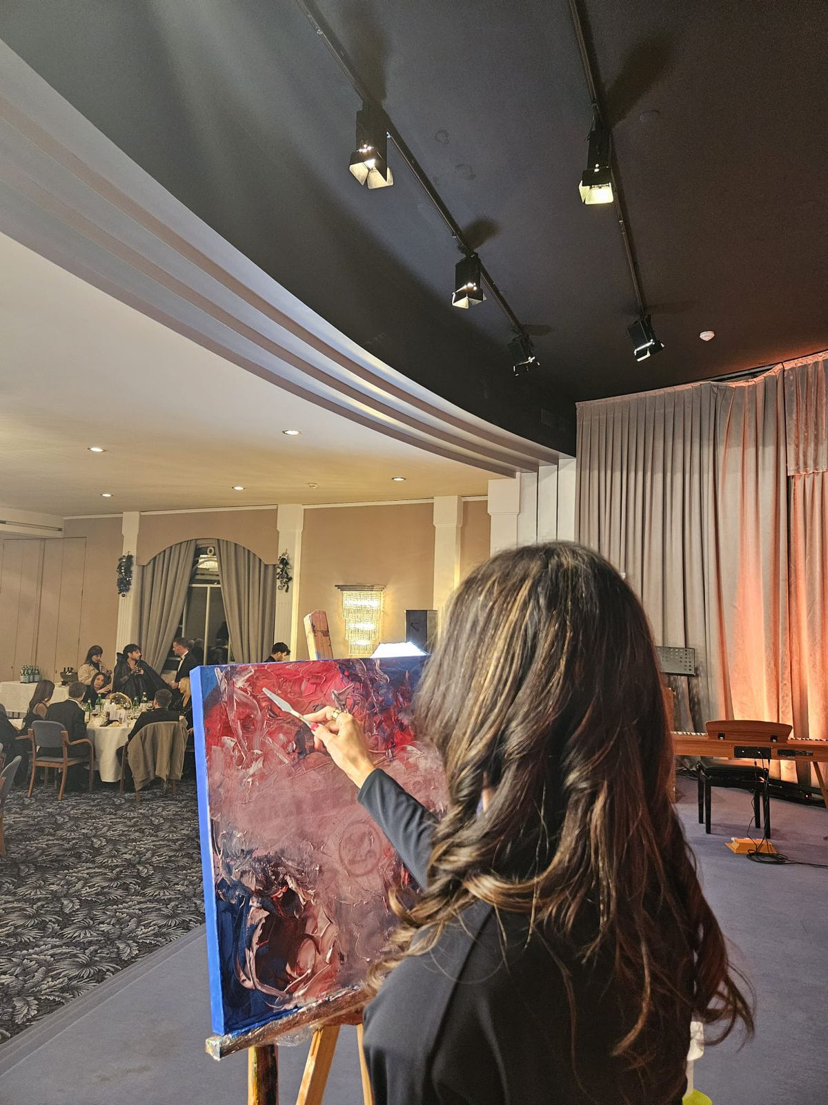 In this setting of refined excellence and global conversation, artist Ilaria Ratti Salvioni took the stage with a live performance that became one of the evening’s defining moments. Surrounded by an audience accustomed to witnessing impactful cultural contributions, Ilaria brought a rare and powerful energy: a fusion of spiritual expression, contemporary abstraction, and emotional immediacy executed directly on stage.